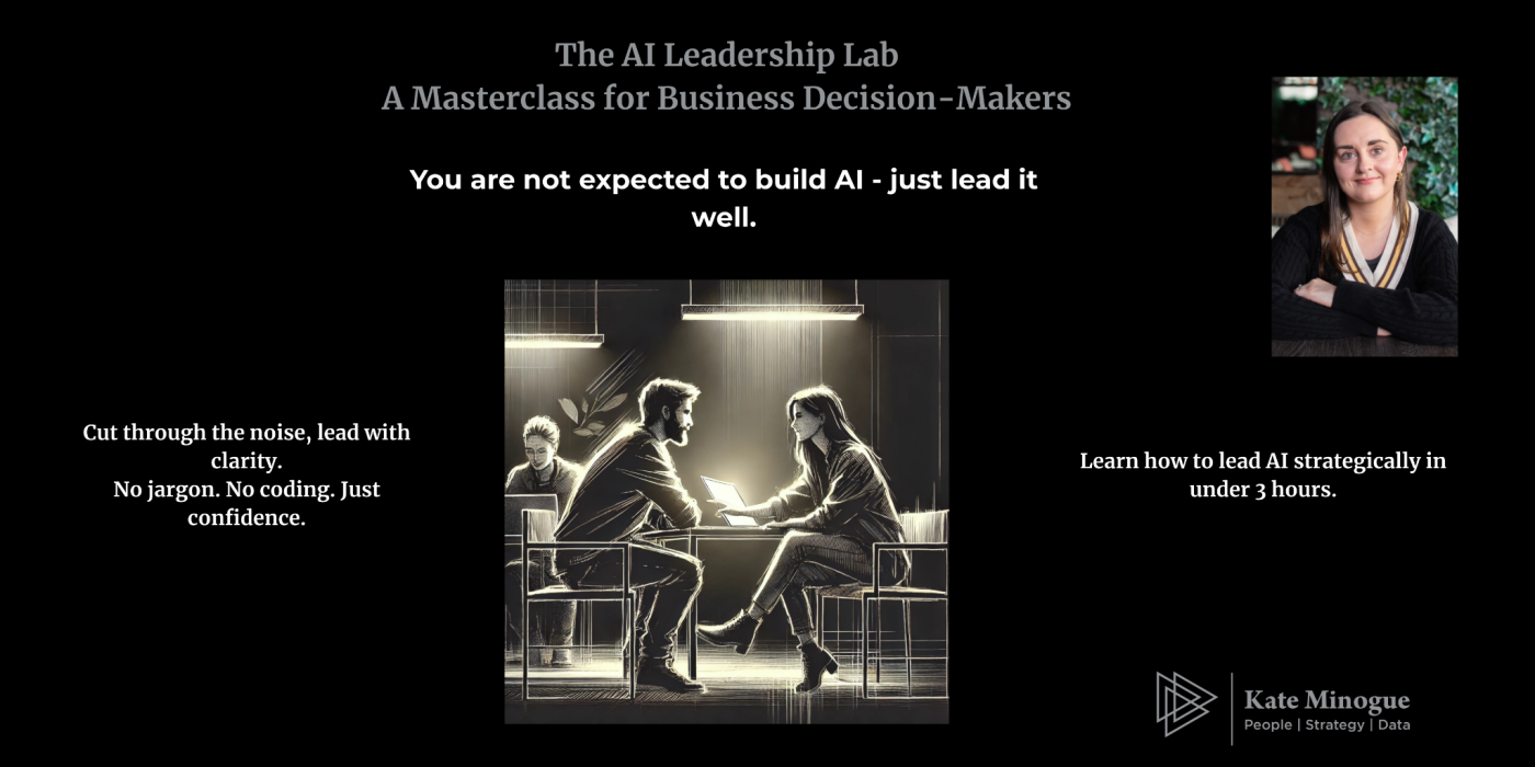 Kate Minogue, senior data strategy and product leader previously from Meta, is supporting business leaders globally to better understand AI, how it can be used to improve business outcomes, and perhaps most importantly from a leadership perspective for ‘non techies’ giving the tools to be able to effectively deliver AI across business functions.